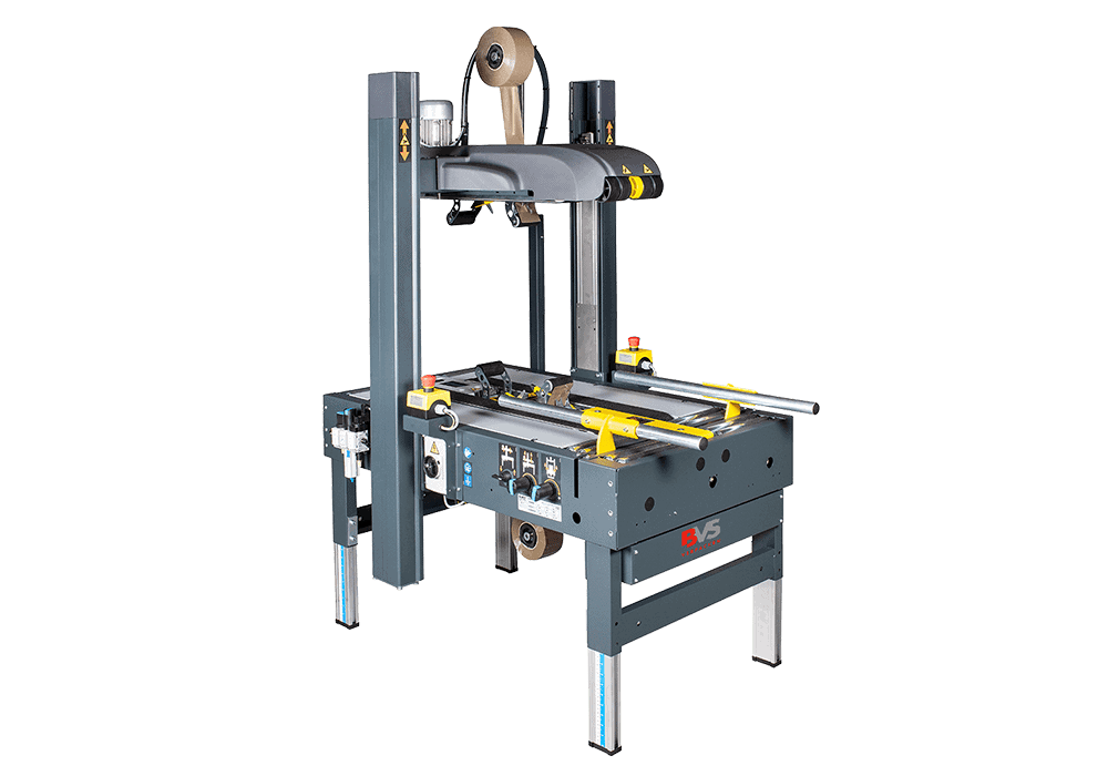 La SR27 è una sigillatrice semiautomatica di alta qualità, ideale per cartoni di medie e grandi dimensioni con formati diversi. Si adatta automaticamente al formato corretto del cartone, grazie all'impostazione automatica del formato. Che si tratti di un formato di 150 × 170 × 120 mm o di grandi scatole speciali di ∞ × 650 × 650 mm, la SR27 si adatta in modo flessibile. La scatola scorre su cinghie di trasmissione superiori e inferiori, in modo che tutto rimanga in movimento.